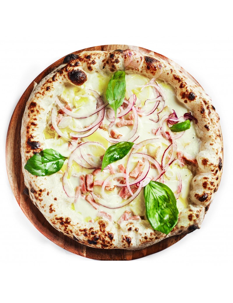Crème fraîche , mozzarella, pomme de terre, lardons de veau, oignons et raclette